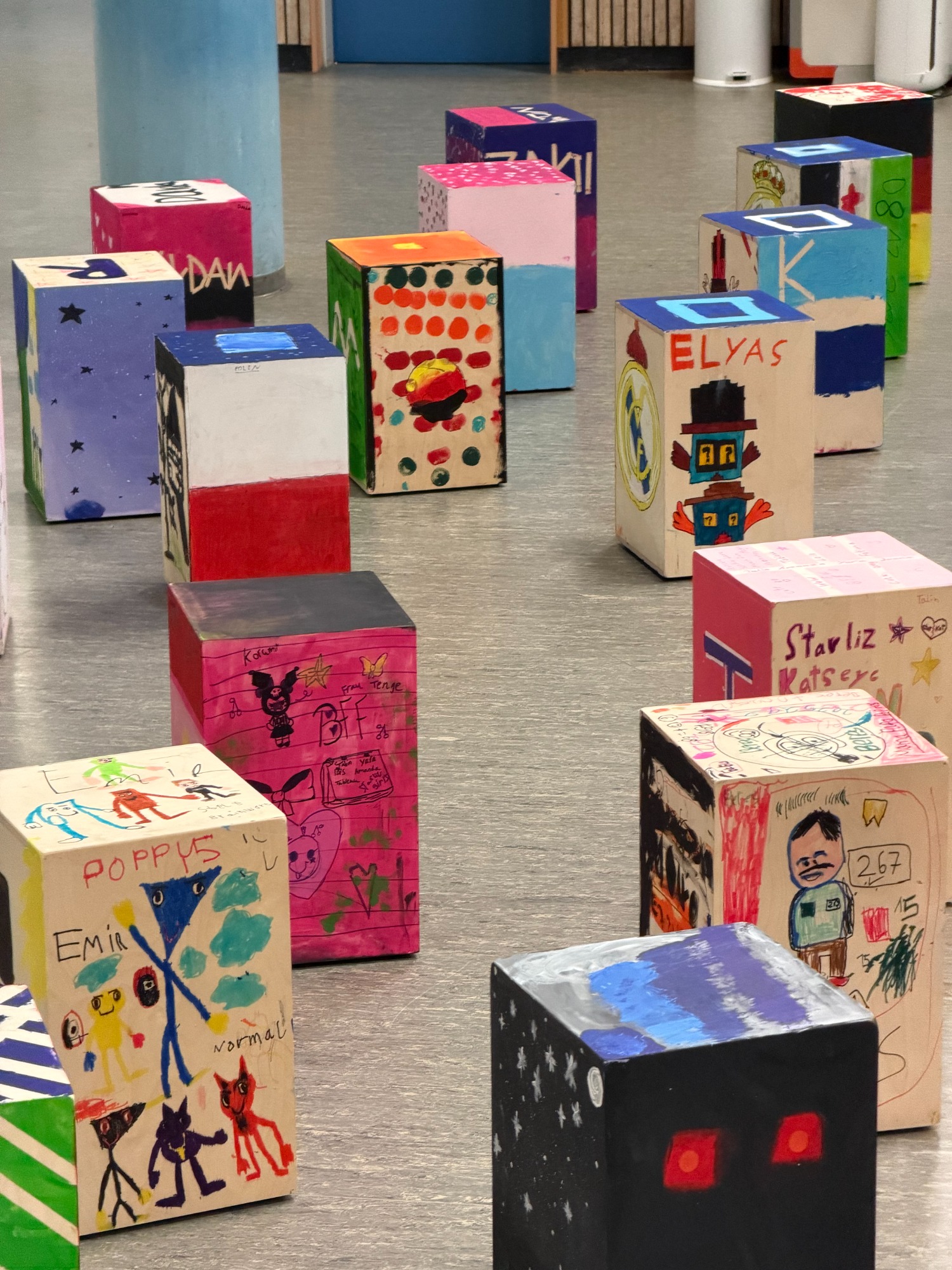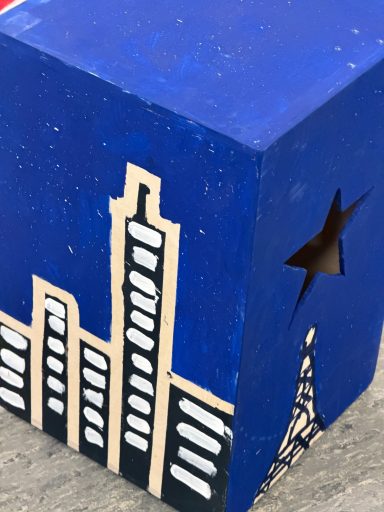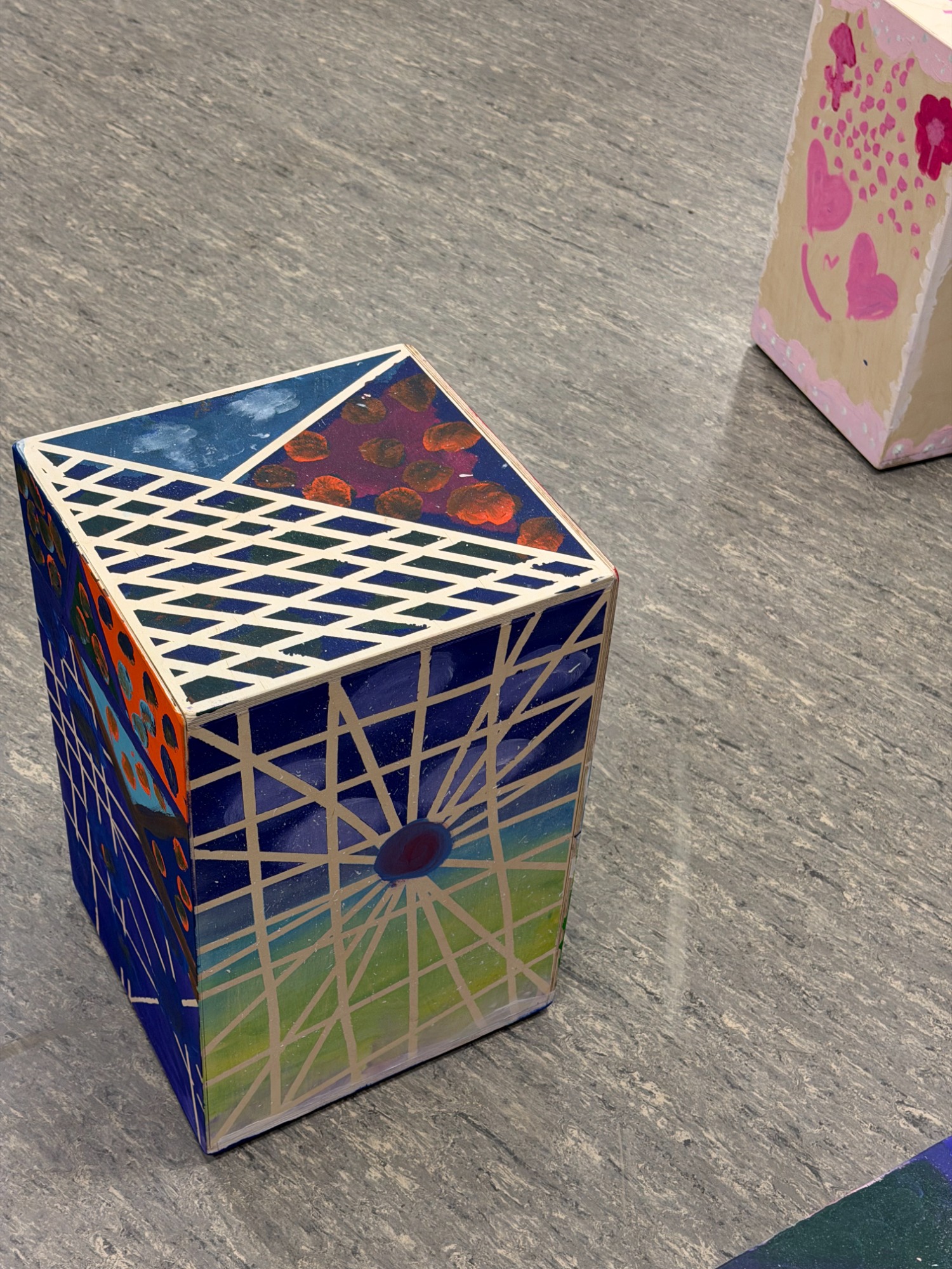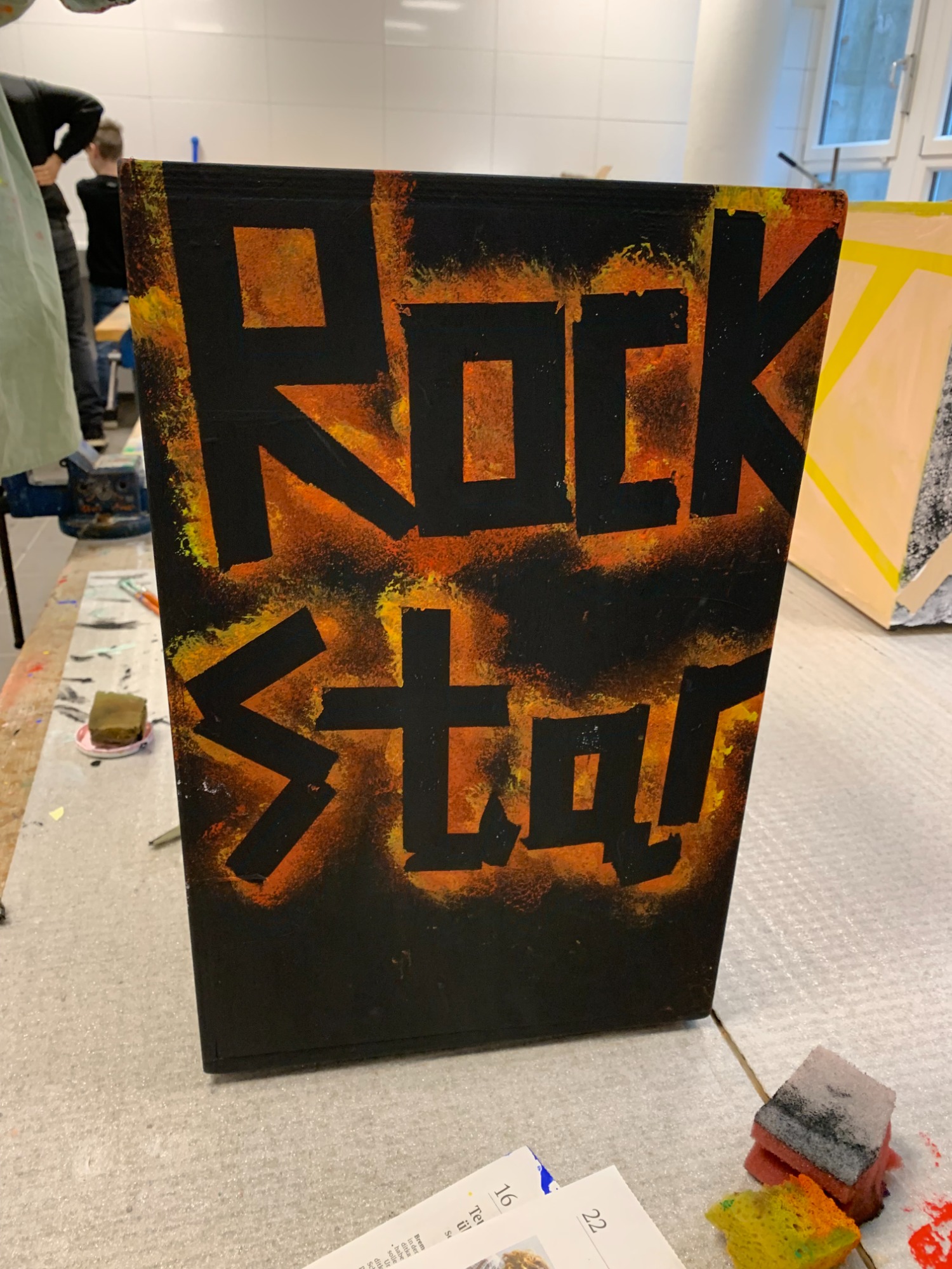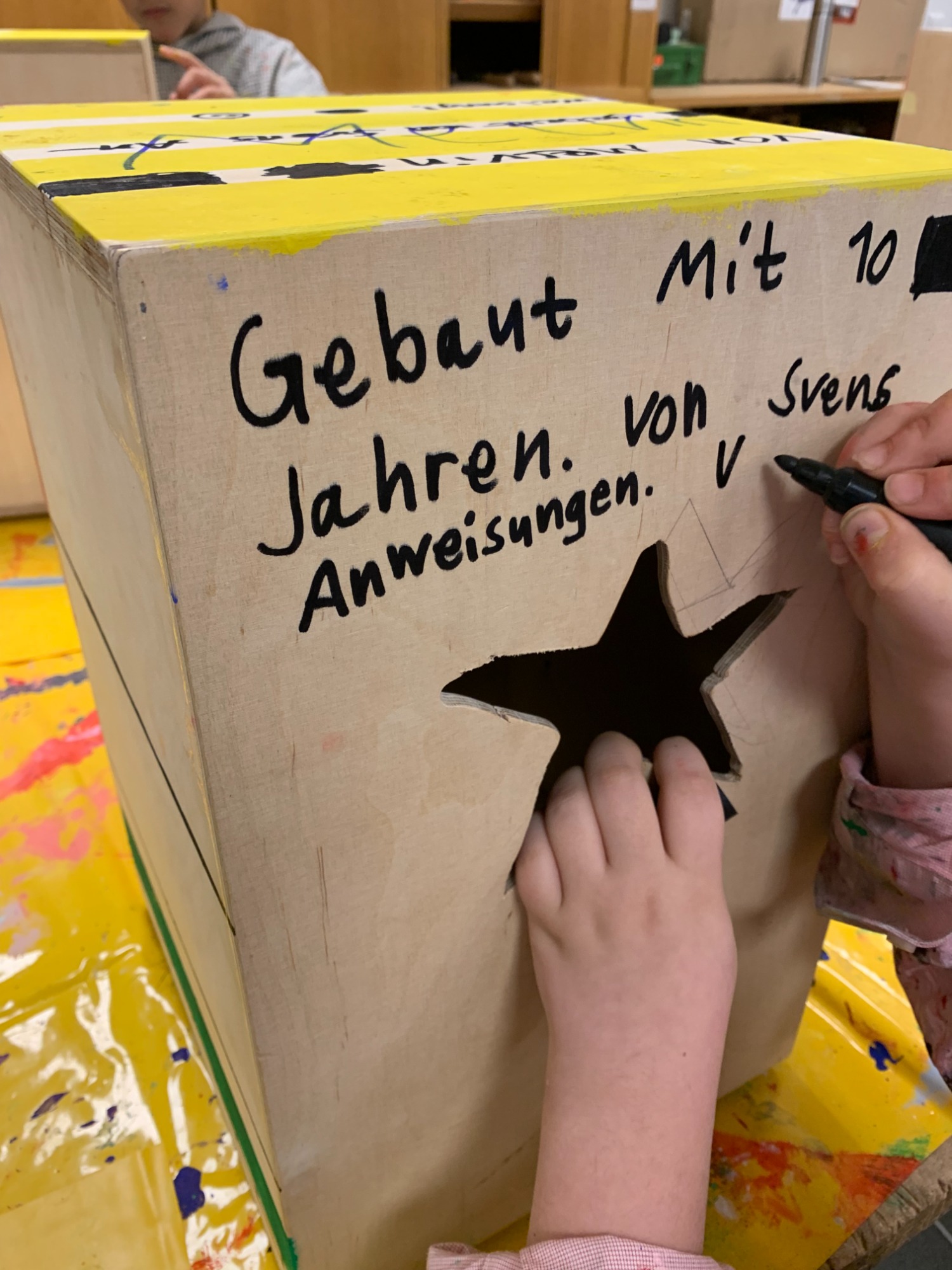 Darauf folgen Stunden zur Gestaltung der Instrumente. Die Cajons können mit diversen Mal/Spritz Techniken individuell designt werden.
